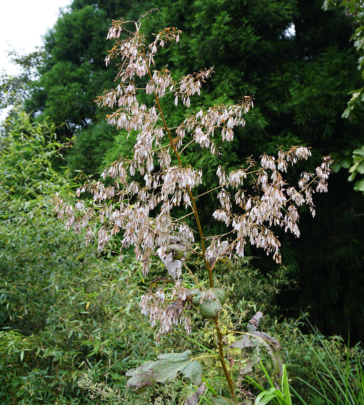 Plume Poppy. 2+m tall and hardy perennial in the poppy family with airy pale yellow flowers followed by decorative drop-shaped seed pods in autumn. Our own collection from Anhui, happily growing in Denmark.