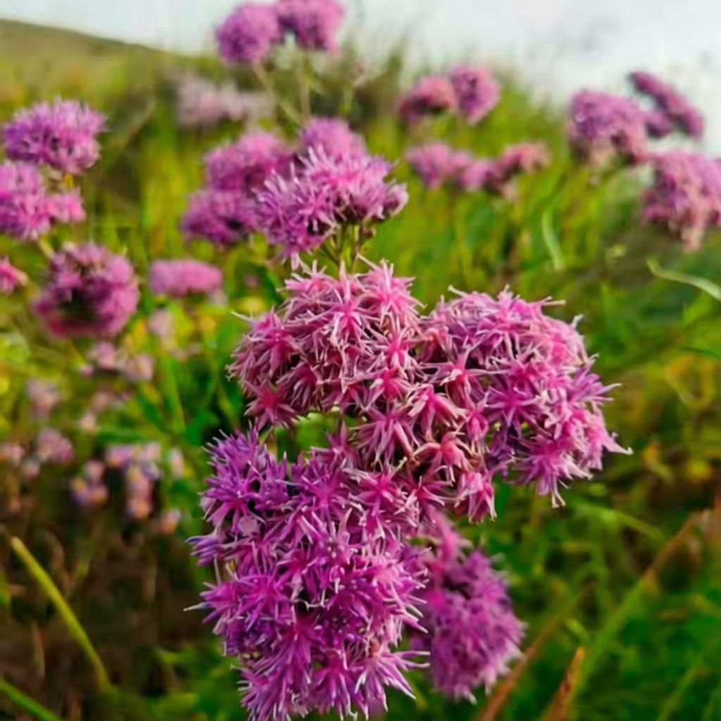 Lovely, possibly monocarpic species, with large sprays of purple flowers on some 70cm tall stems. Bone hardy and easy, and rather untypical for a Saussurea.